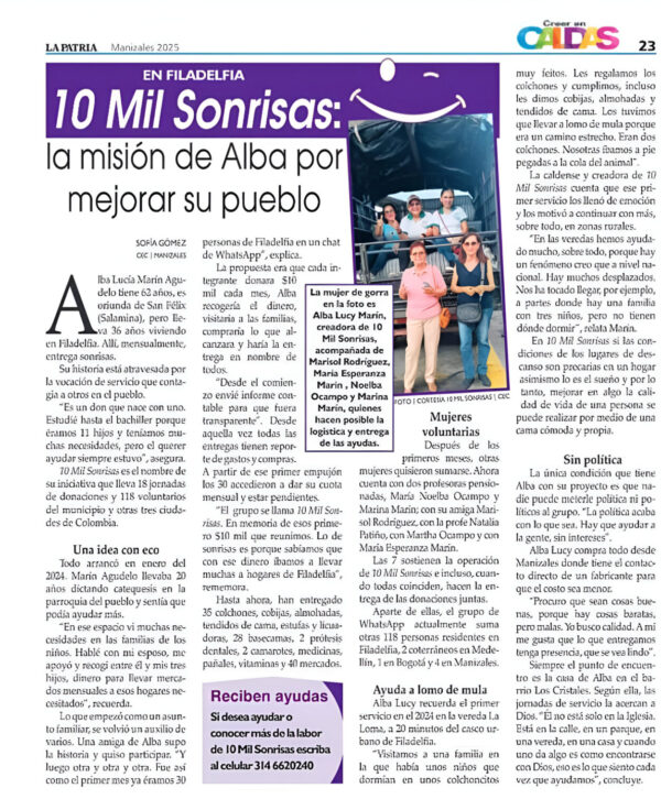 Apoyamos con orgullo a la Fundación 10 Mil Sonrisas, una organización social con sede en Filadelfia, Caldas, que realiza una labor invaluable en el Eje Cafetero. Esta organización mejora las condiciones de: